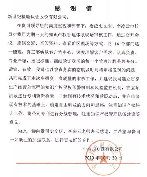 四O四對認(rèn)證審核工作高度重視、積極配合,順利通過知識產(chǎn)權(quán)管理體系的認(rèn)證審核,證書認(rèn)證范圍是:與核燃料的加工,核設(shè)施退役相關(guān)的知識產(chǎn)權(quán)管理。在征得公司同意之后,BCC將四O四作為優(yōu)秀貫標(biāo)案例向國家知識產(chǎn)權(quán)局進行了推薦。