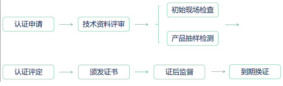 綠色產(chǎn)品認(rèn)證的流程包括:申請——技術(shù)資料評審、受理——現(xiàn)場檢查、產(chǎn)品抽樣評審——認(rèn)證決定——證書發(fā)放——證后監(jiān)督——到期換證
