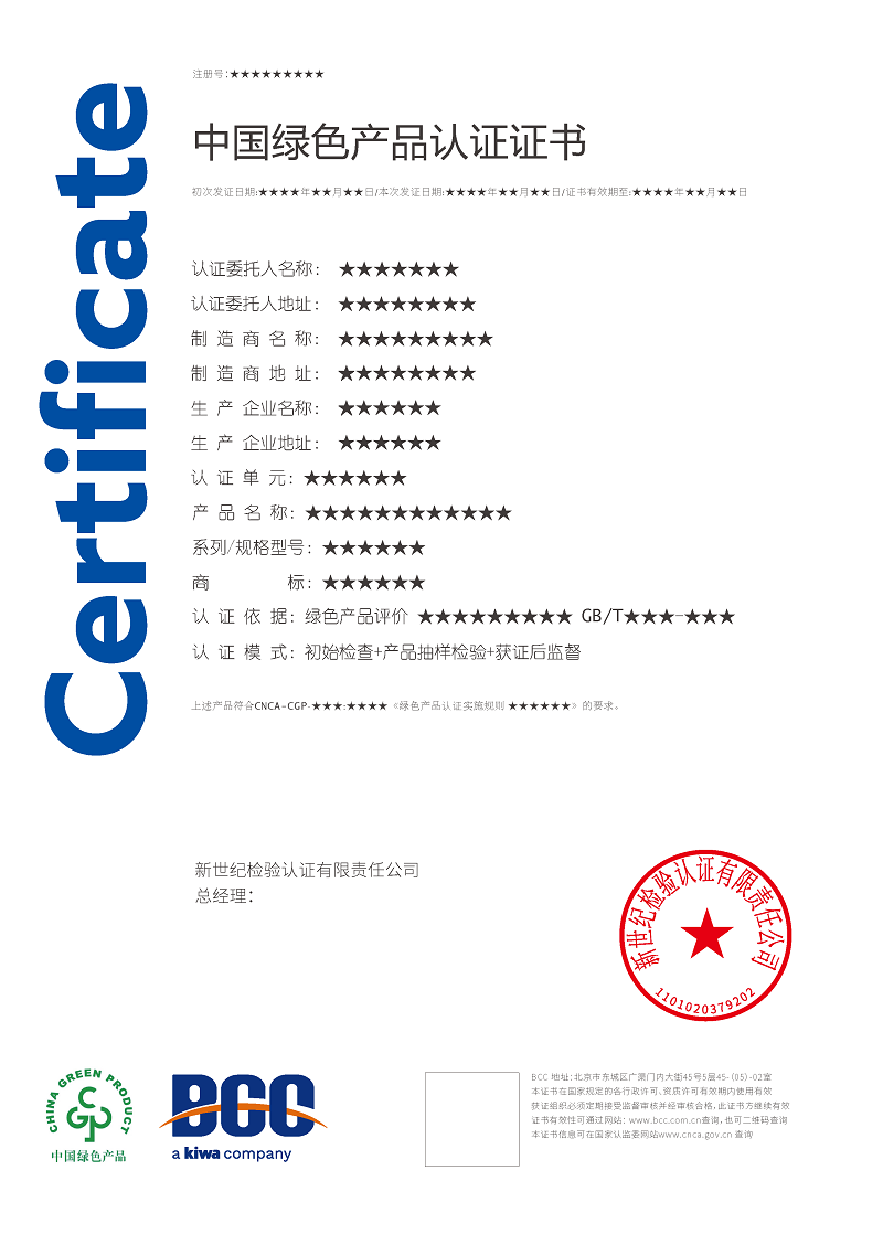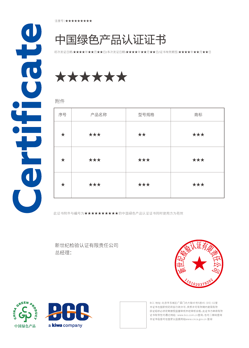 目前,BCC已順利通過國家認(rèn)證認(rèn)可監(jiān)督管理委員會(CNCA)審批,獲得了多項綠色產(chǎn)品認(rèn)證資質(zhì),包括: