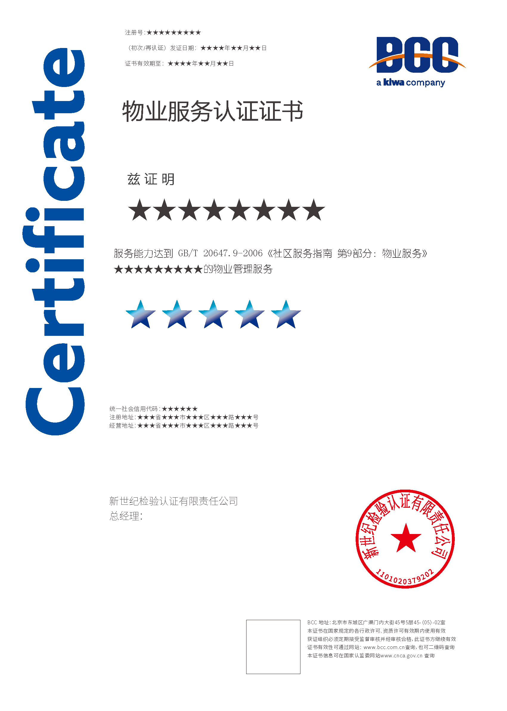 依據(jù)GB/T20647.9 《社區(qū)服務(wù)指南 第9部份:物業(yè)服務(wù)》標(biāo)準(zhǔn)要求,對(duì)企業(yè)進(jìn)行物業(yè)體系審查。認(rèn)證審查的結(jié)果是證明企業(yè)按照標(biāo)準(zhǔn)實(shí)施了物業(yè)服務(wù),并達(dá)到了某一個(gè)高度(星級(jí))。它是評(píng)分制的認(rèn)證標(biāo)準(zhǔn),按評(píng)價(jià)的分值來(lái)衡量服務(wù)能力的高低。