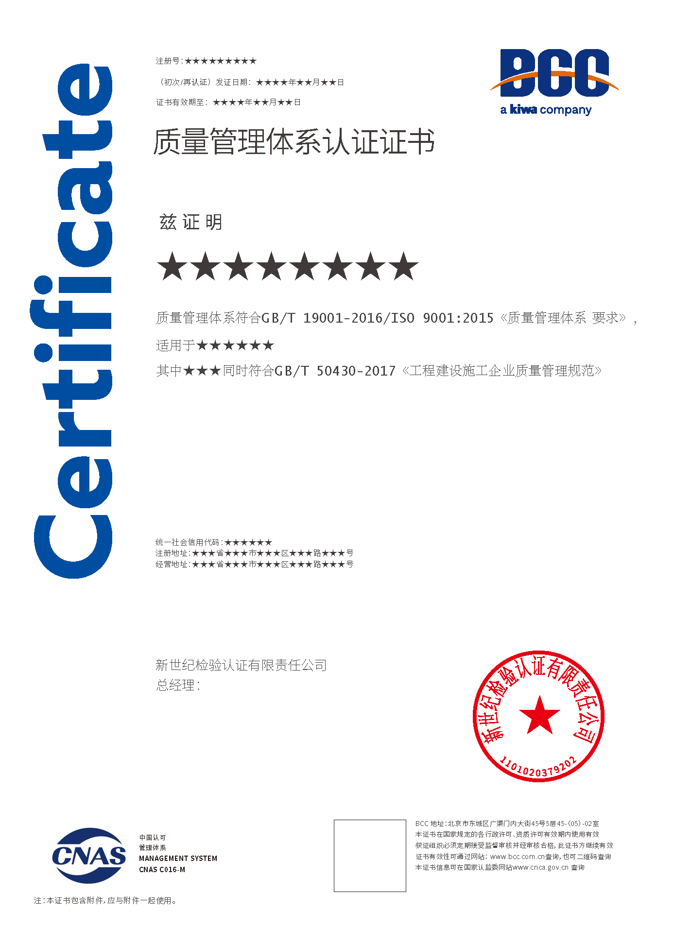 工程建設(shè)施工企業(yè)質(zhì)量管理體系認(rèn)證適用于建設(shè)施工單位(住建部頒發(fā)資質(zhì)的施工企業(yè)),既可以用于施工總承包的單位,如:建筑工程、市政公用工程、電力工程、公路工程、鐵路工程、機(jī)電工程等;此外,還可用于專業(yè)承包的單位,如:防水防腐保溫工程、建筑裝修裝飾工程、消防設(shè)施工程、建筑幕墻工程、電子與智能化工程、建筑機(jī)電安裝工程、環(huán)保工程、鋼結(jié)構(gòu)工程等。