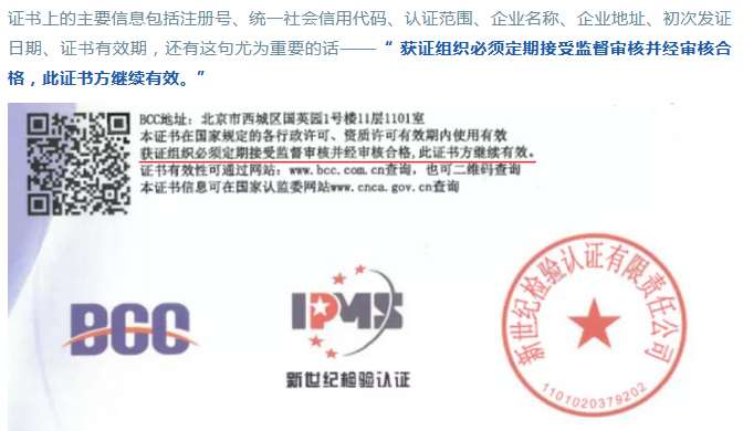 證書上的主要信息包括注冊號、統(tǒng)一社會(huì)信用代碼、認(rèn)證范圍、企業(yè)名稱、企業(yè)地址、初次發(fā)證日期、證書有效期,還有這句尤為重要的話——“ 獲證組織必須定期接受監(jiān)督審核并經(jīng)審核合格,此證書方繼續(xù)有效。”