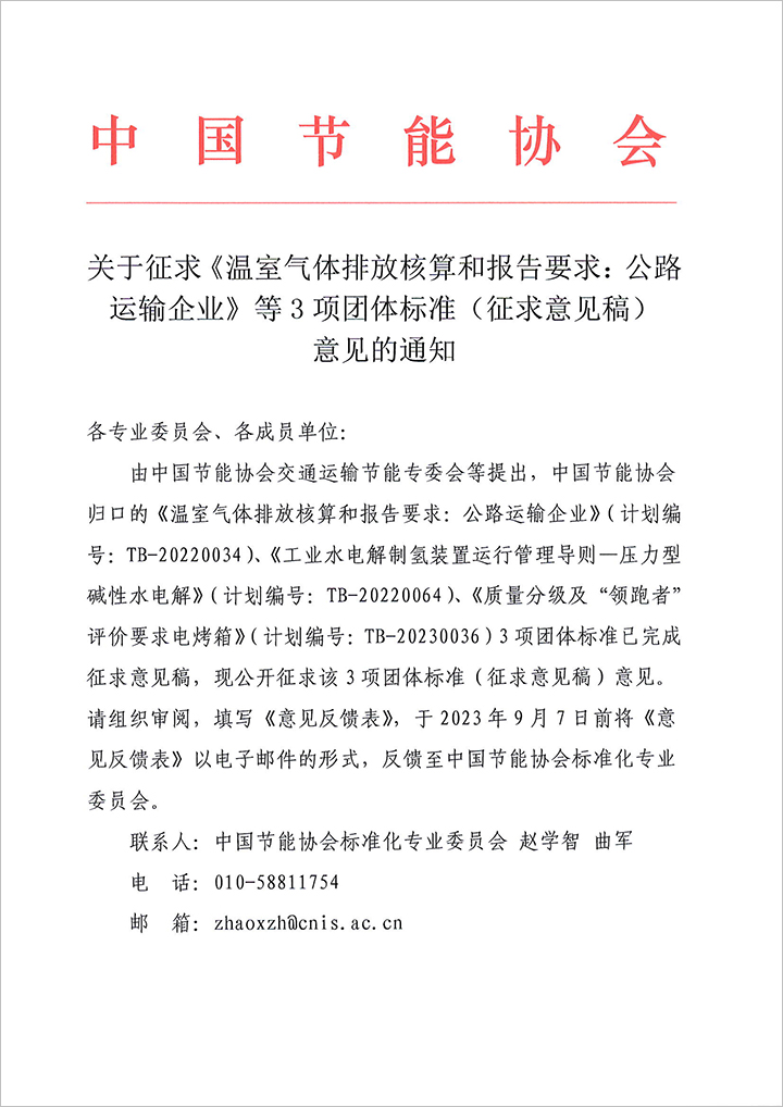關(guān)于征求《溫室氣體排放核算和報(bào)告要求:公路運(yùn)輸企業(yè)》等3項(xiàng)團(tuán)體標(biāo)準(zhǔn)(征求意見稿)意見的通知