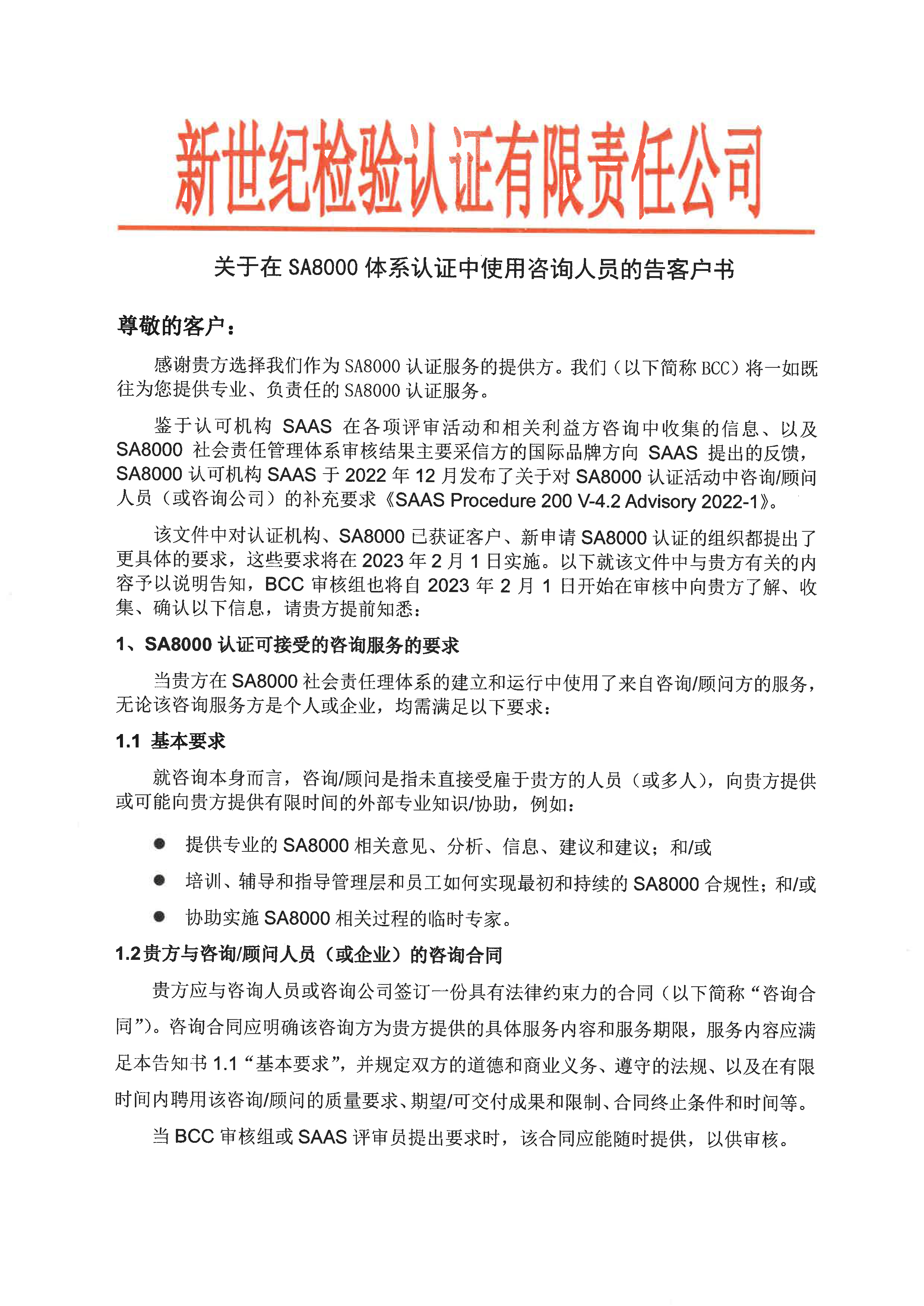 關(guān)于在SA8000體系認(rèn)證中使用咨詢?nèi)藛T的告客戶書