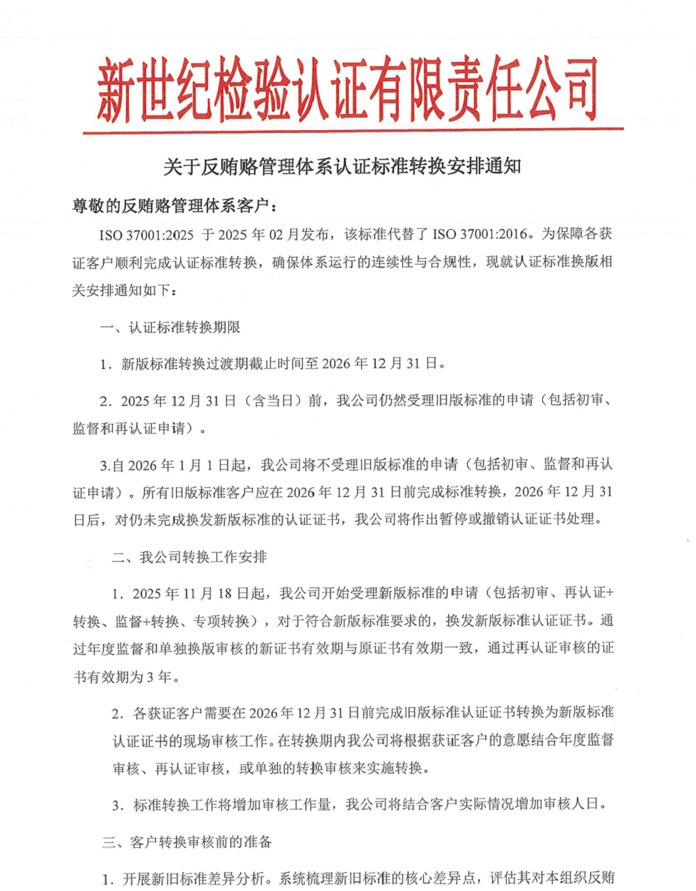 3.自2026年1月1日起,我公司將不受理舊版標(biāo)準(zhǔn)的申請(包括初審、監(jiān)督和再認(rèn)證申請)。所有舊版標(biāo)準(zhǔn)客戶應(yīng)在2026年12月31日前完成標(biāo)準(zhǔn)轉(zhuǎn)換,2026年12月31日后,對仍未完成換發(fā)新版標(biāo)準(zhǔn)的認(rèn)證證書,我公司將作出暫?;虺蜂N認(rèn)證證書處理。